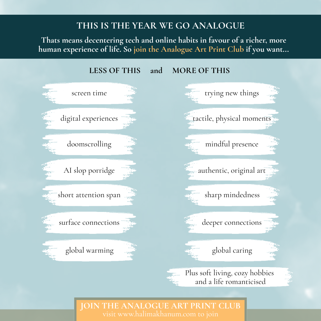 If soft living, cozy hobbies, or digital detoxes are your thing then become a member of the Analogue Art Print Club and invite real connection, whimsy and creativity back into your life!
